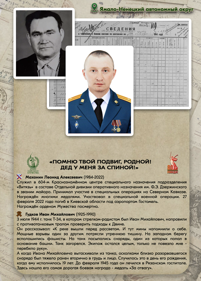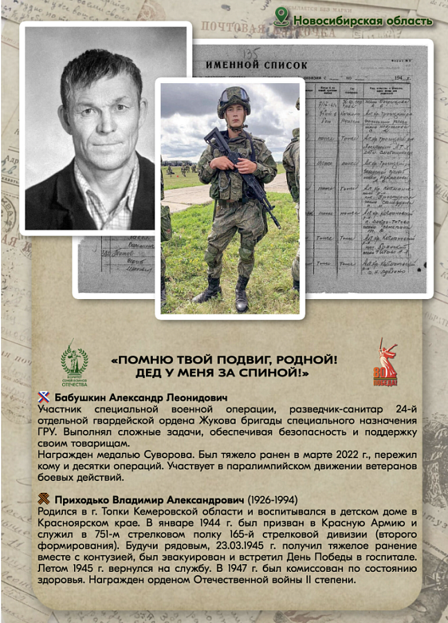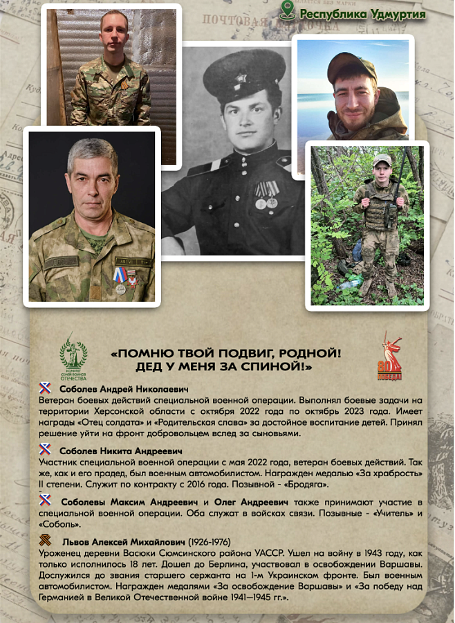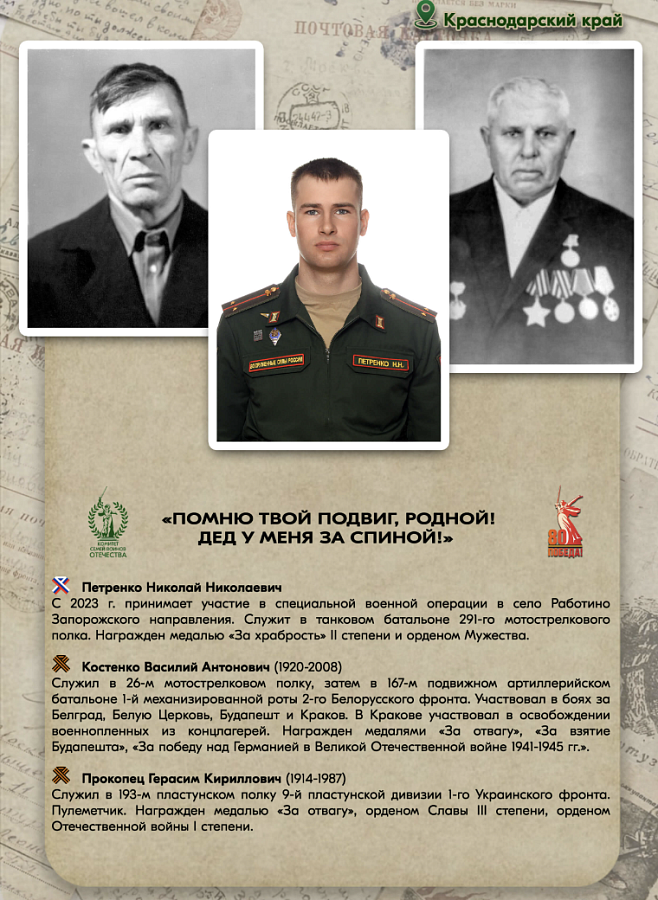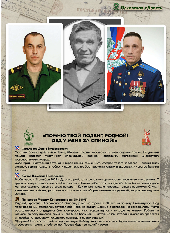 Ты участник СВО и в твоей семье есть прадед, участвовавший в Великой Отечественной войне? Тогда расскажи об этом! Чтобы принять участие, заполни анкету на сайте pomnytvoypodvig.ru и напиши историю своего боевого пути и твоего родственника.