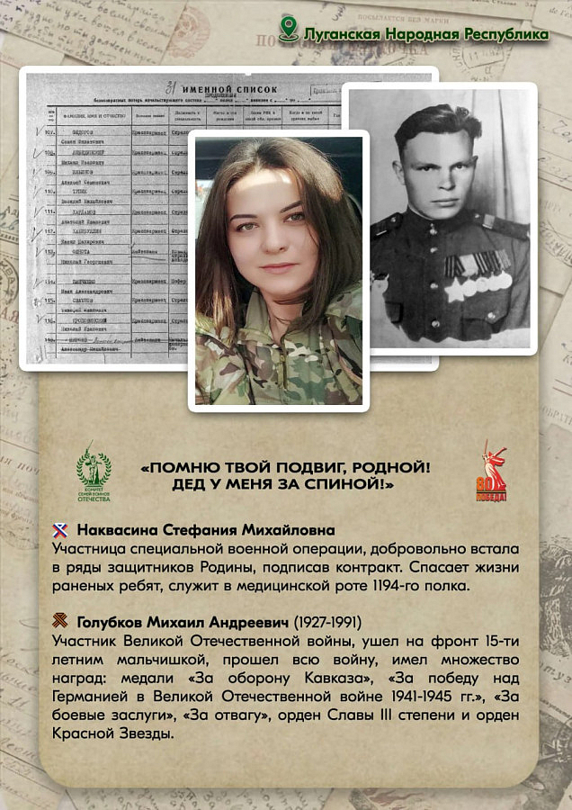 Дан старт всероссийскому проекту «Помню твой подвиг, родной! Дед у меня за спиной!», приуроченному к Году защитника Отечества и 80-летию Победы. Его цель — собрать истории участников Специальной военной операции и их родственников, которые сражались в годы Великой Отечественной войны.